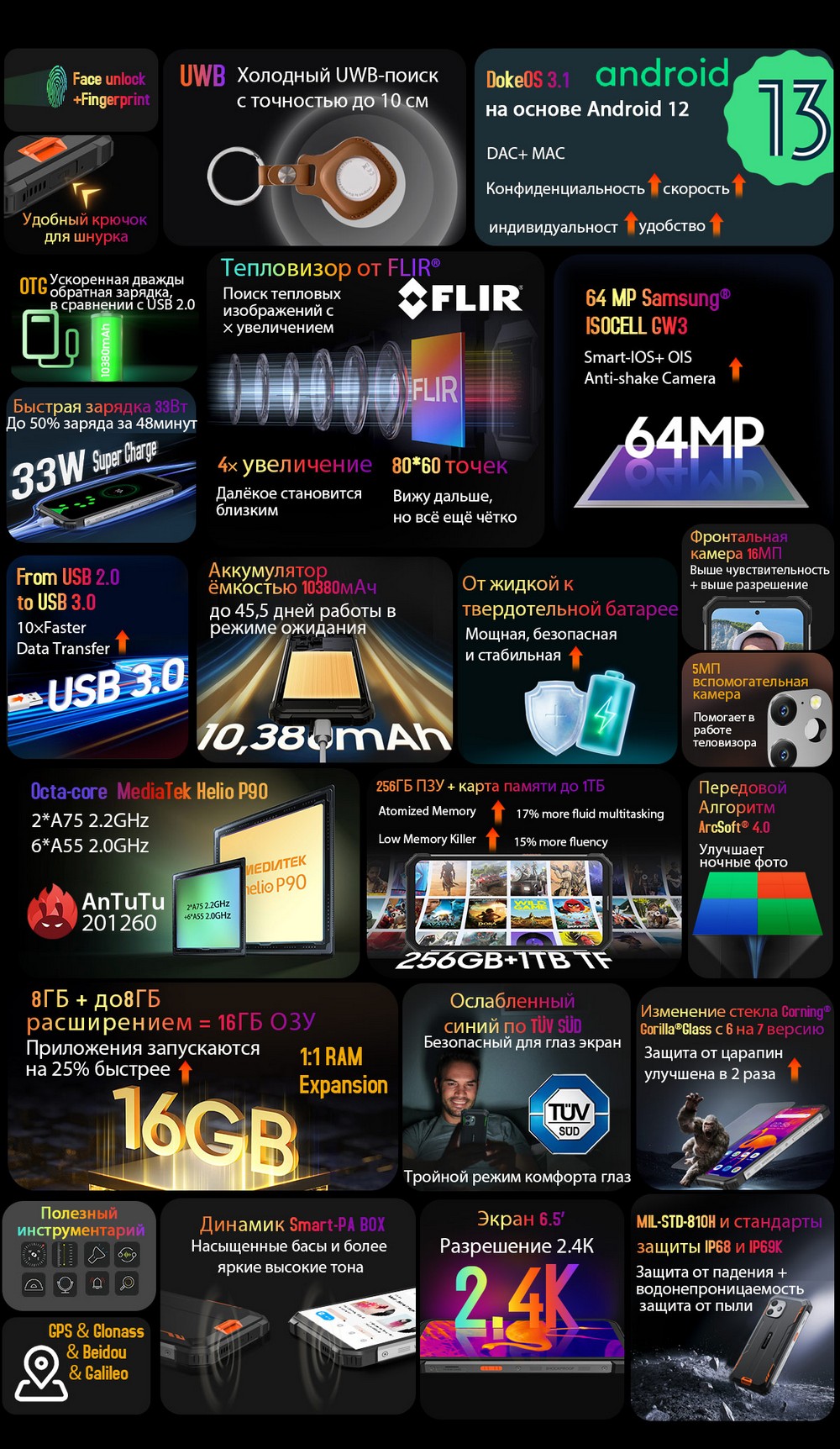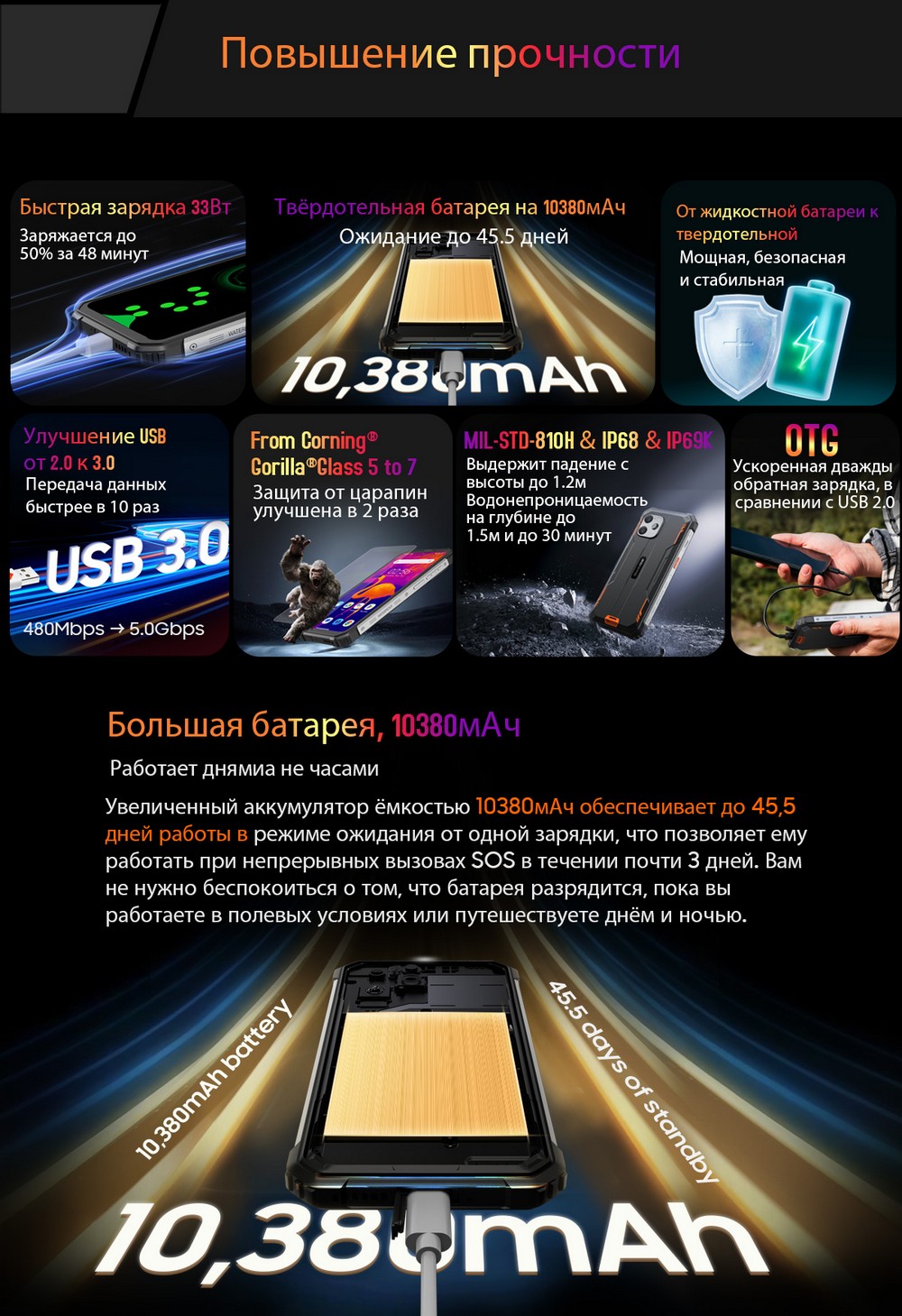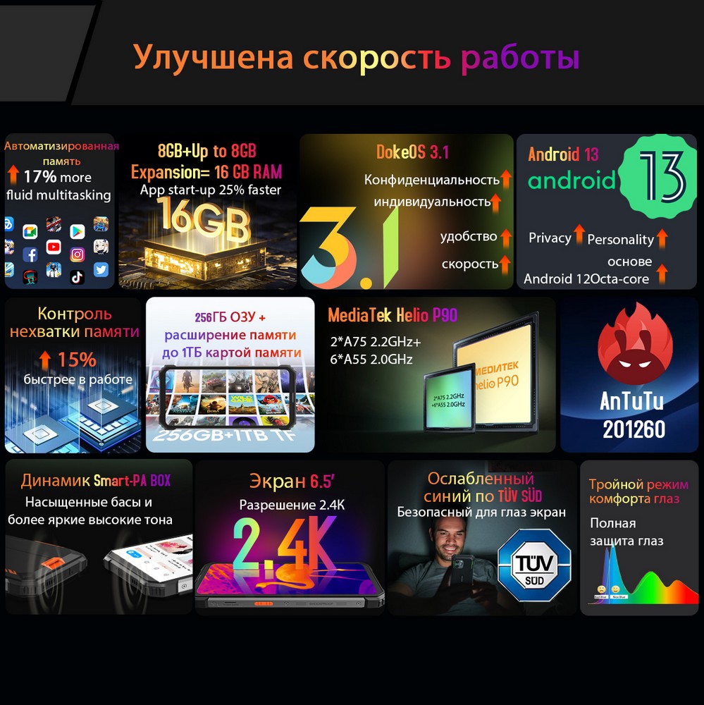 | Дополнительно | Мощный аккумулятор |