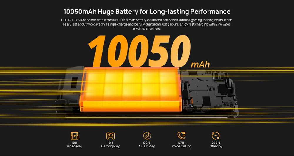 - Модель оснащена очень емким аккумулятором 10050 mah, благодаря которому пользователь может смотреть видео на протяжении 16 часов и использовать смартфон в режиме звонков 30 часов.