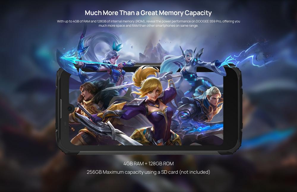- Производитель установил в Doogee S59 Pro 4 Гб ОЗУ и накопитель 128 Гб.