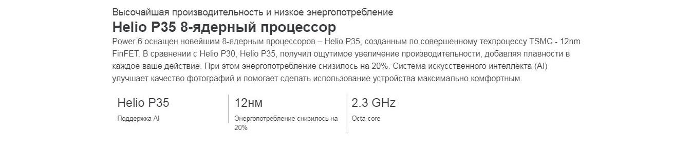 - Внутри смартфона трудится чипсет Helio P35, у которого в подчинении находятся 8 ядер с максимальной частотой 2.3 ГГц.