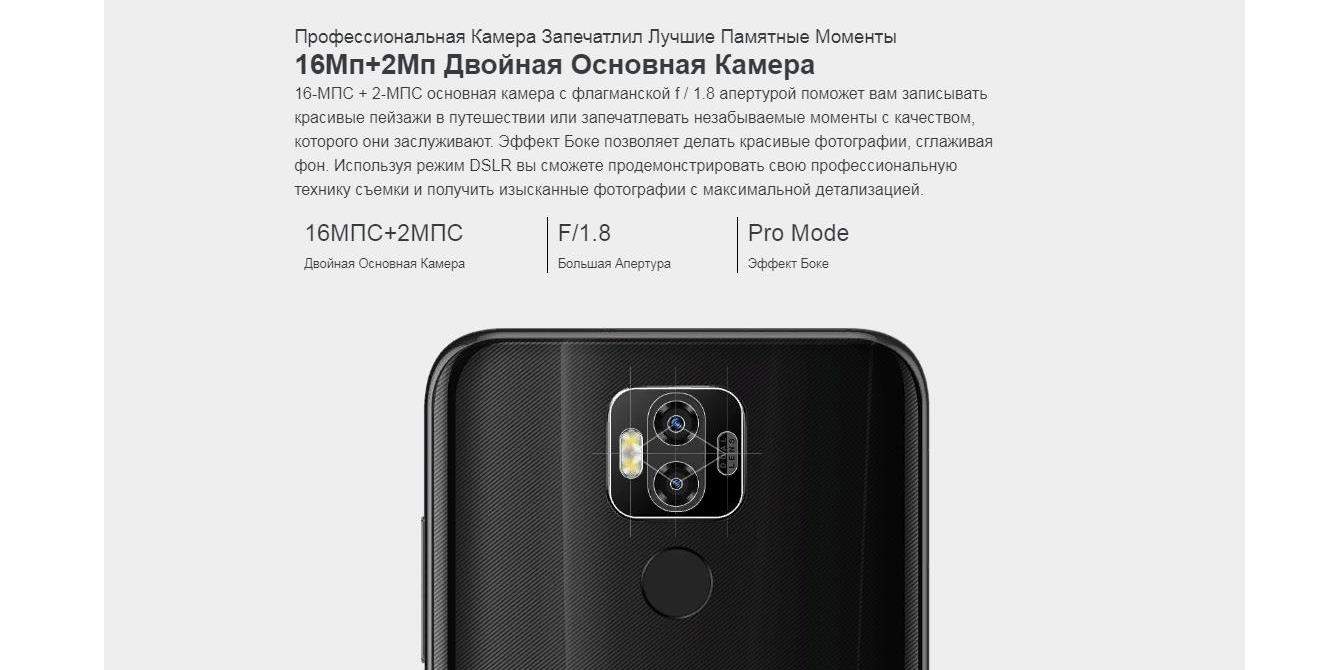 - Двойная тыловая камера 16.0 Mpix + 2.0 Mpix с апертурой F/1.8;